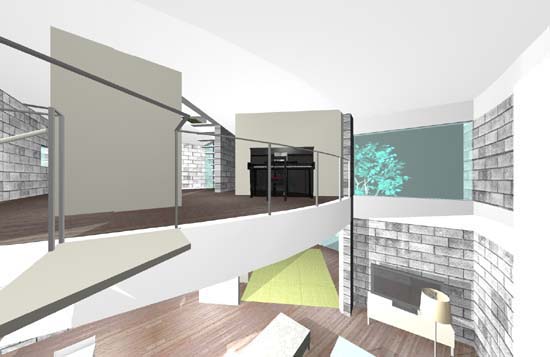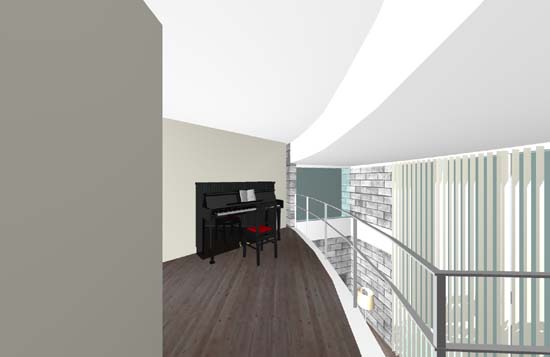 No8:螺旋階段踊り場からピアノのあるワークスペースを見る